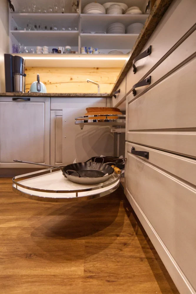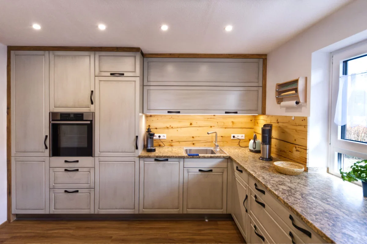 Die Fronten der Küche haben wir mit Hilfe der CNC in Rahmenoptik hergestellt. Es sind Schleiflackfronten die mit einer Patina veredelt sind. Die Patina zusammen mit den schwarzen Bogengriffen geben der Küche einen Vintage touch. Die Sichtseiten und Wandabschlüsse haben wir wieder aus Altholz hergestellt. Genau so den Spritzschutz der aus der mittleren Lage der Altholzbalken ist und mit Epoxidharz versiegelt wurde. So sieht man zwar die Risse und Wurmlöcher im Holz, kann die Wand aber ganz normal abwischen, wie z.B. einen Spritzschutz aus Glas.