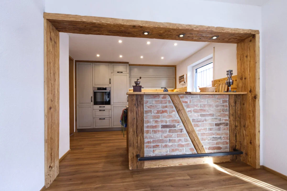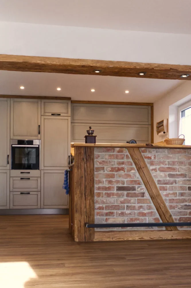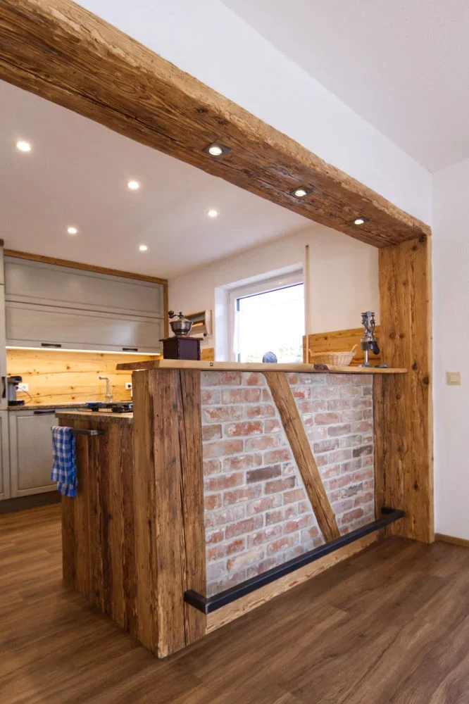 Zwei weitere Highlights sind die Steinarbeitsplatte und die Theke. Beim Stein hat sich unser Steinmetz Hermann wieder ins Zeug gelegt und einen „Giallo Veneziano“ der super zum Altholz und den Fronten passt gebracht. Die Theke haben wir mit Altholz und alten Klinkersteinen gefertigt mit einer Platte aus Olivenholz. So kann man beim Kochen an der Theke stehen und die Küche ist vom Essbereich abgetrennt.