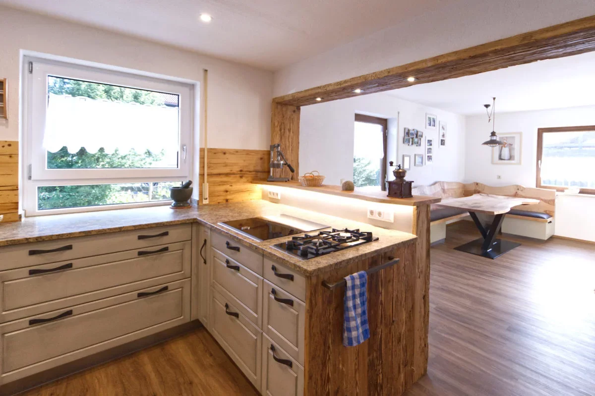 Angela und Roland haben ihr Haus renoviert, da darf natürlich eine neue Küche von uns nicht fehlen. Im ersten Gespräch hat sich herausgestellt, dass Angela schon lange von einer Wohnküche träumt. Also einer Küche mit angrenzendem Wohn- und Essbereich. Außerdem gefällt Angela die Rahmenoptik der Landhausstil-Küchen super und beide lieben Holz. Altholz und wildes Massivholz mit viel Maserung und ausgekitteten stellen, wie Rissen und Ästen.